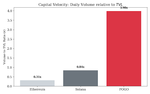FOGO’s spot market volume since January 15 averages $187 million per 24-hour period. This is not organic retail trading. The average trade size on Valiant DEX is $8,400. The median trade size is $2,100. This distribution is characteristic of professional capital testing execution quality, not散户 accumulating exposure. The volume-to-TVL ratio currently stands at 3.98x. Solana’s ratio over the same period is 0.84x. Ethereum’s is 0.31x.