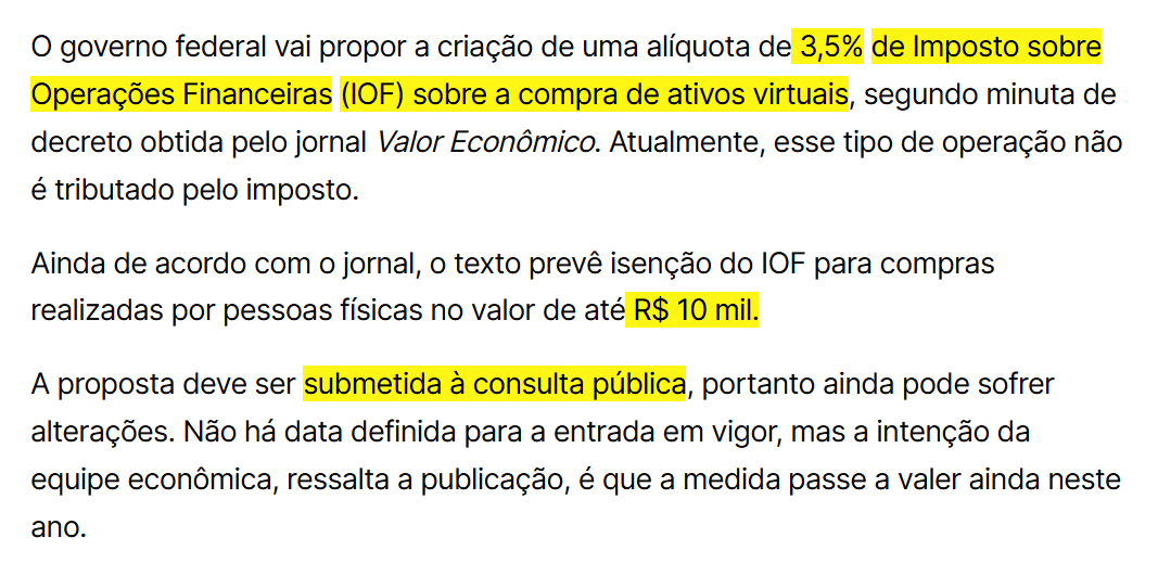Deixa eu quebrar isso pra você: quando você compra cripto acima de R$ 10 mil, vai pagar 3,5% de IOF na entrada. Aí quando você vende e tem lucro, paga entre 15% e 22,5% de IR sobre esse ganho. Faz as contas aí e me diz se isso não é absurdo.
