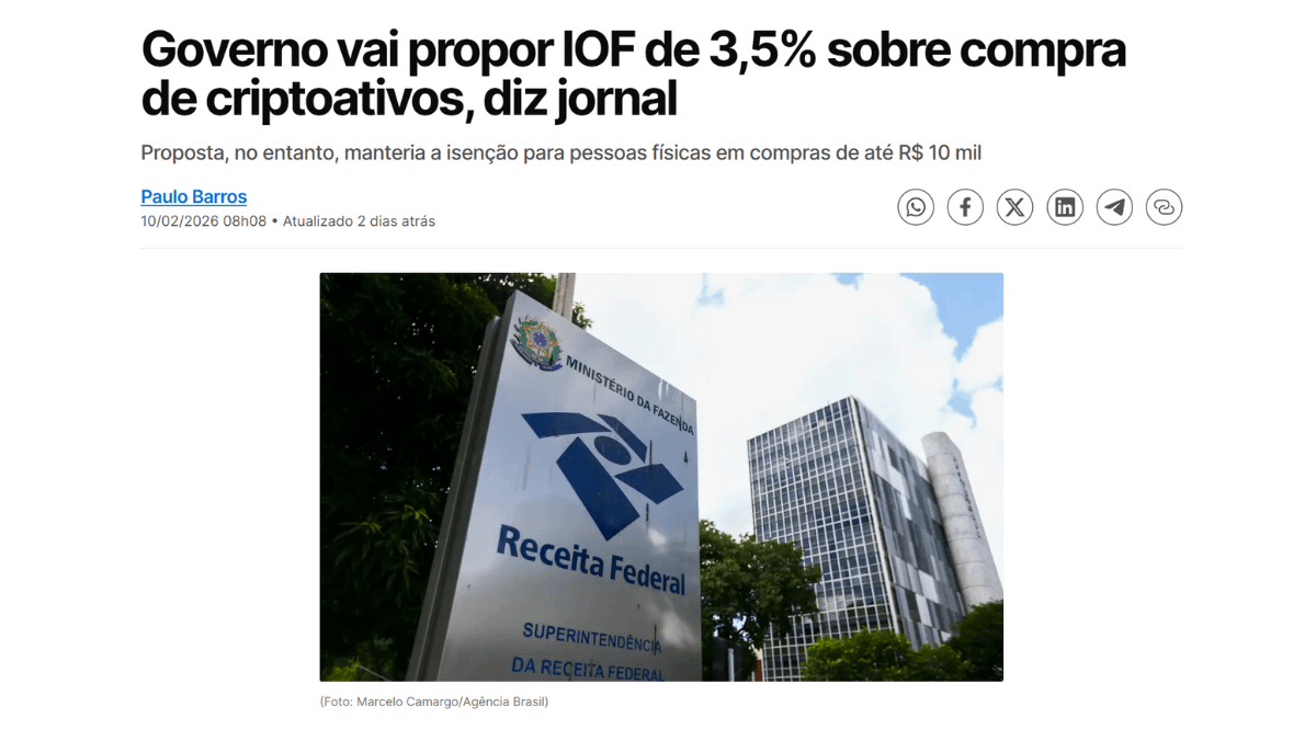 Agora em fevereiro de 2026 vem essa proposta de IOF de 3,5%. Além disso, rolou a equiparação de certas operações cripto a operações de câmbio, o que já mudou bastante o cenário regulatório.