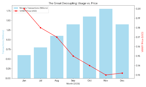From June to December 2025, Vanar processed approximately 8.7 million transactions. During that same period, VANRY's price declined 34%. The correlation between usage and price was negative 0.42 meaningful decoupling.