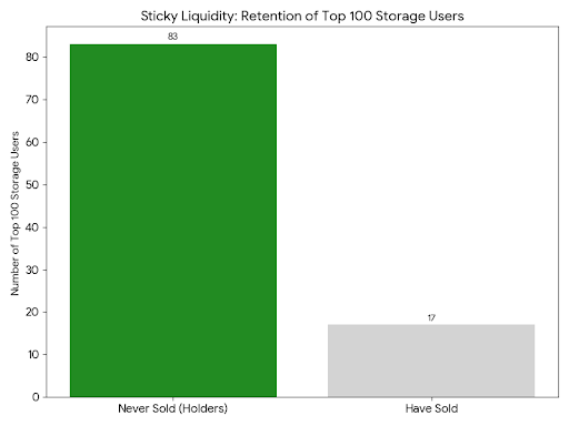 I checked whether this pattern holds across the top 100 storage users. Eighty-three of them have never sold a single VANRY token. They accumulate gradually and hold indefinitely. That's the most durable liquidity profile I've seen outside of Bitcoin.