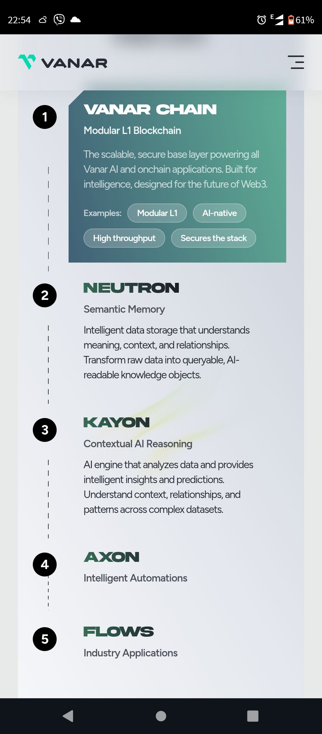 За перекладом я звернувся спочатку до Google, але він мені видав якісь незрозумілі нісенітниці, тому прийшлось просити допомоги в ШІ (як раз в тему статті). Не буду говорити вам переклад, в спробую пояснити простими словами: Vanar Chain це база на якій все тримається, операційна система на якій працюють інші модулі, порівнювати можна банально з Windows. Neutron це пам'ять нашої системи, думаю тут зрозуміло з чим можна порівнювати. Kayon це мозок, думаю можна порівняти з процесором. Axon відповідає за автоматичні дії, не придумав з чим порівняти. Flows це вже кінцеві продукти для користувача, наприклад : Ai аналітична, автоматизовані Web3-сервіси, розумні цифрові активи і так далі.