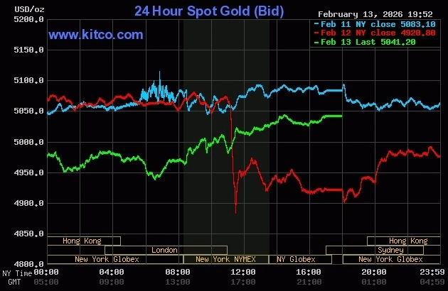 Chốt phiên giao dịch 13/2, giá vàng thế giới giao ngay tăng 120 USD lên 5.041 USD một ounce. Diễn biến này đảo chiều so với phiên trước đó, khi giá giảm 3% xuống thấp nhất gần 1 tuần.