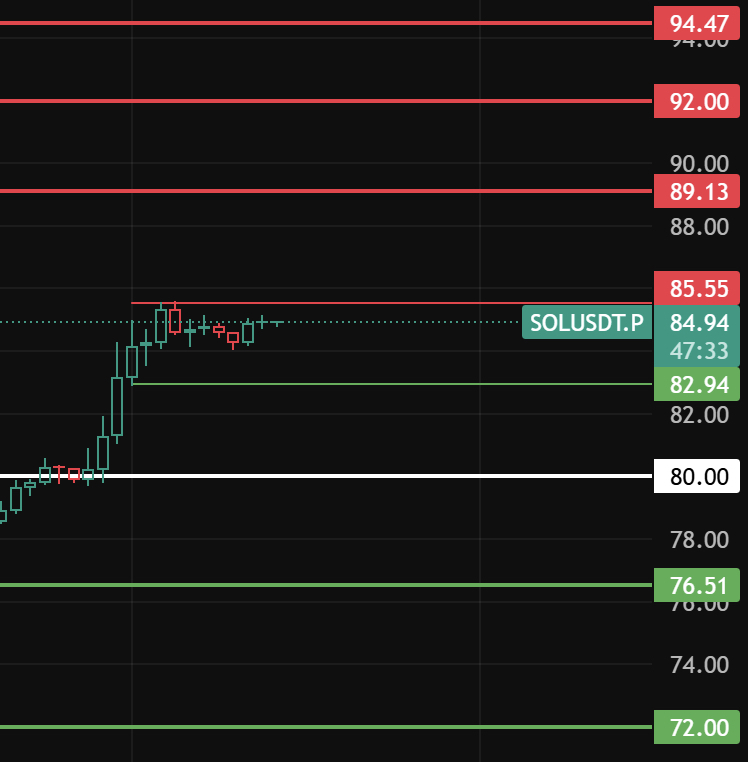 SOL今天留意横盘区的顶85,只有突破才会继续往上,上方压力位留意89-92-94这几个位置附近!