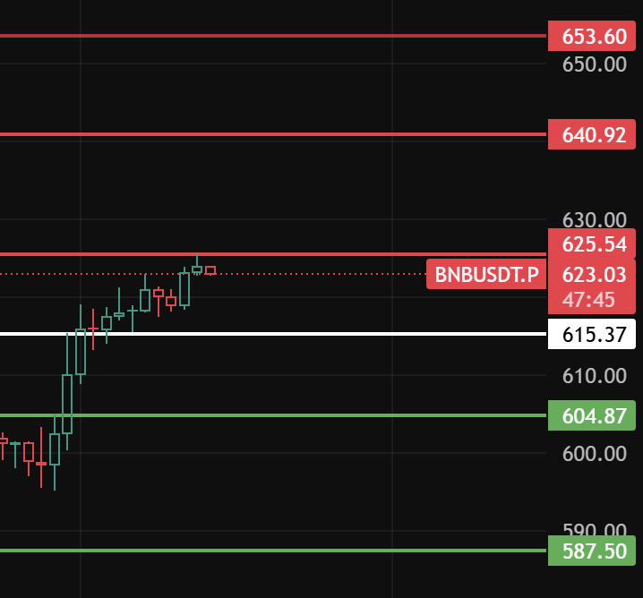 如果今天1-2小时级别跌破615后反弹不上去,那1-2小时级别开始回调,下方支撑位留意604-587-571这几个位置附近!#BNB走势