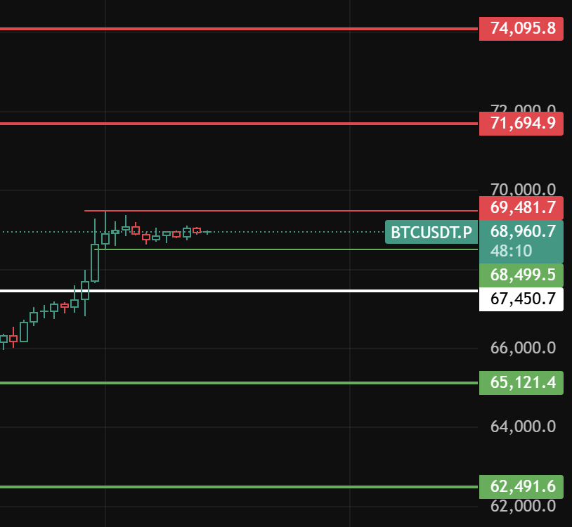 大饼今天留意横盘区的顶69480,只有突破才会继续往上,上方压力位留意71700-74100-76790这几个位置附近!