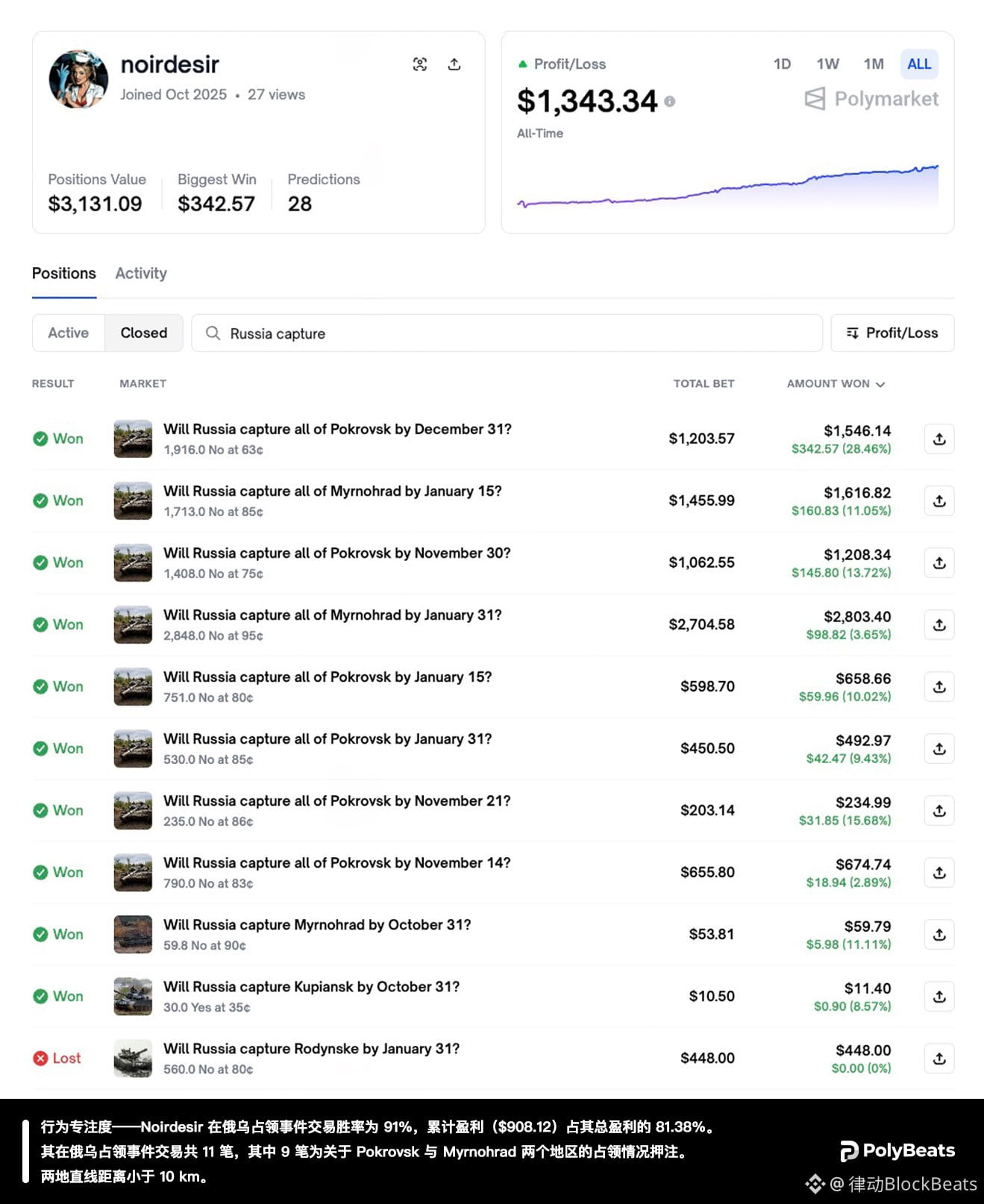行为专注度——Noirdesir 在俄乌占领事件交易胜率为 91%,累计盈利($908.12)占其总盈利的 81.38%。其在俄乌占领事件交易共 11 笔,其中 9 笔为关于 Pokrovsk 与 Myrnohrad 两个地区的占领情况押注。两地直线距离小于 10 km。
