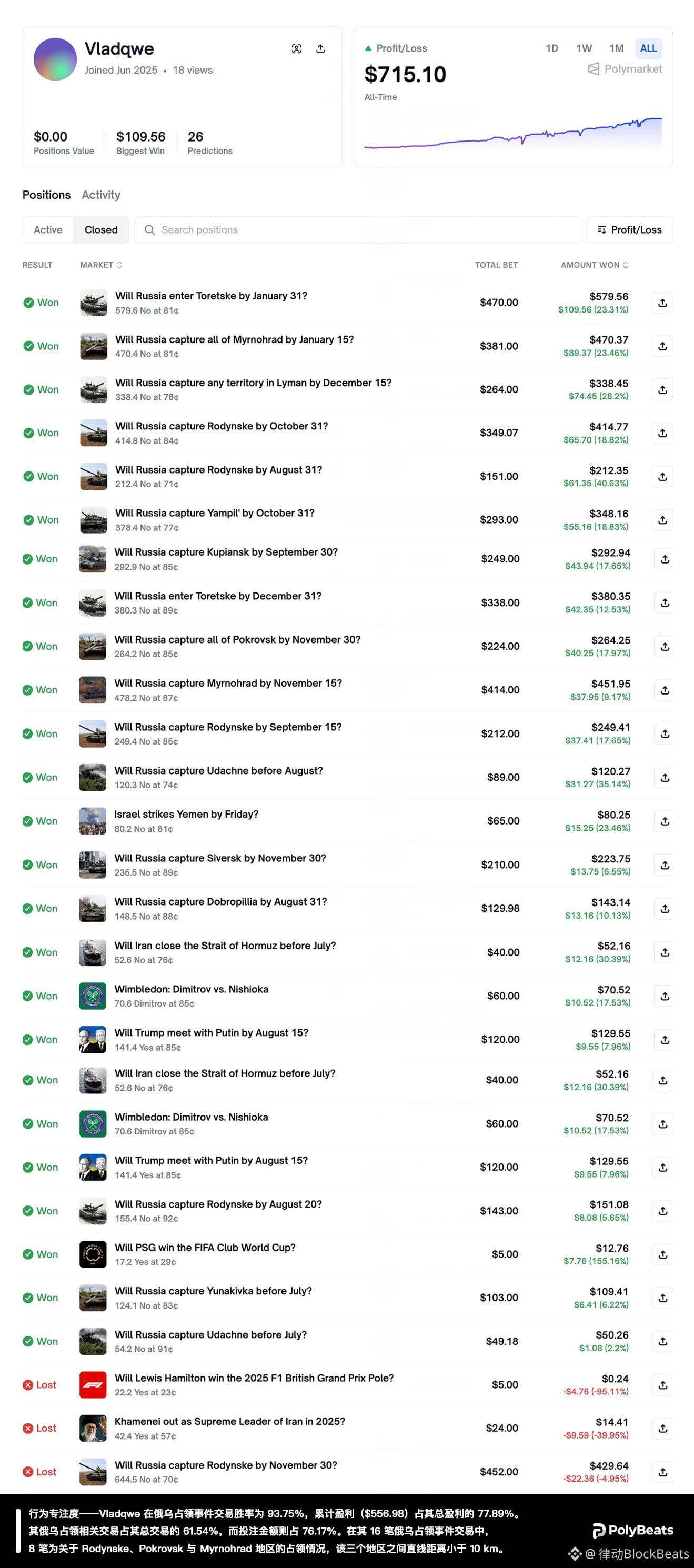 行为专注度——Vladqwe 在俄乌占领事件交易胜率为 93.75%,累计盈利($556.98)占其总盈利的 77.89%。其俄乌占领相关交易占其总交易的 61.54%,而投注金额则占 76.17%。在其 16 笔俄乌占领事件交易中,8 笔为关于 Rodynske、Pokrovsk 与 Myrnohrad 地区的占领情况,该三个地区之间直线距离小于 10 km。