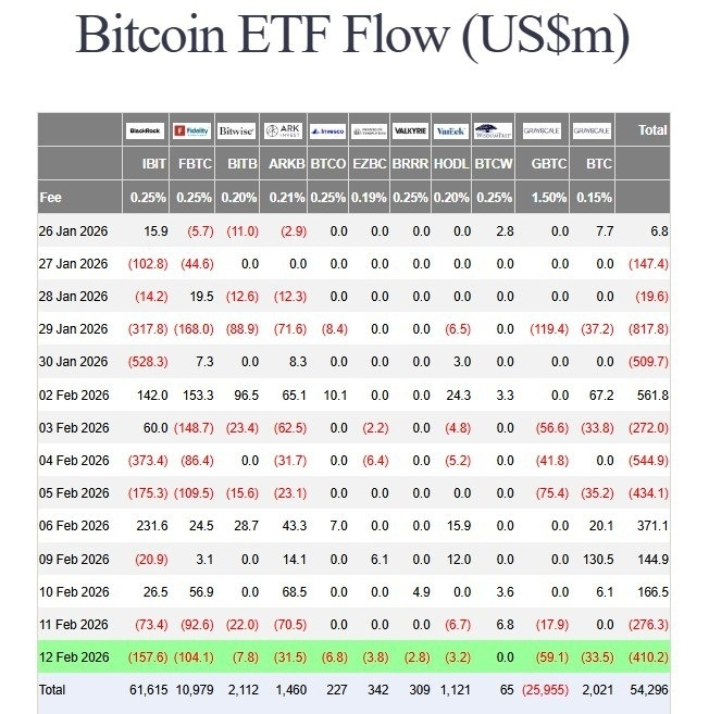 Bitcoin ETFs saw a single-day outflow of $410 million, marking the fourth consecutive week of redemptions. Assets under management have plummeted from a peak of $170 billion to approximately $80 billion, clearly indicating institutional investors are reducing risk rather than buying the dip