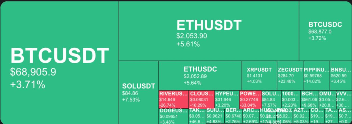 🚬Утречко, криптаны! Пока вы спали, рынок решил подкинуть нам немного «зелени» на альтах, но общая атмосфера в чатах напоминает поминки. Биткоин топчется около $68,905, доминация зашкаливает за 58,90%, а индекс страха и жадности вмерз в пол на отметке 11.