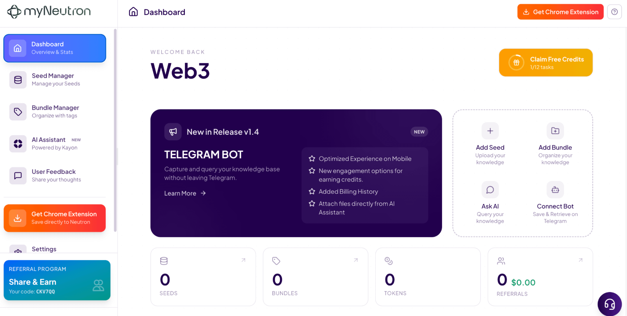 The dashboard welcomes you like a control center — clean, simple, and surprisingly powerful. You can manage seeds, organize knowledge bundles, access AI assistants, and even connect tools like Telegram without leaving your workflow.