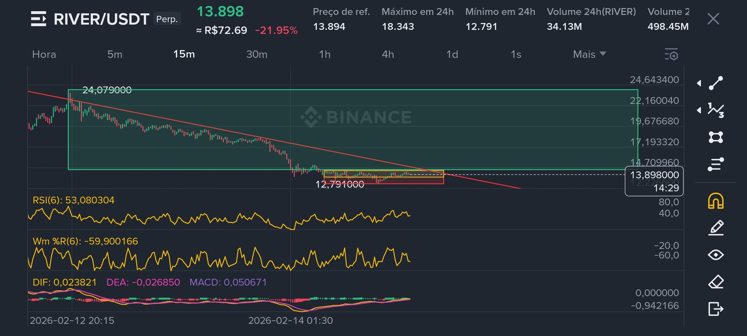 Com base no suporte de 24h em 12.79 e na estrutura de pivô em 15m, a estratégia foca em capturar o repique técnico.