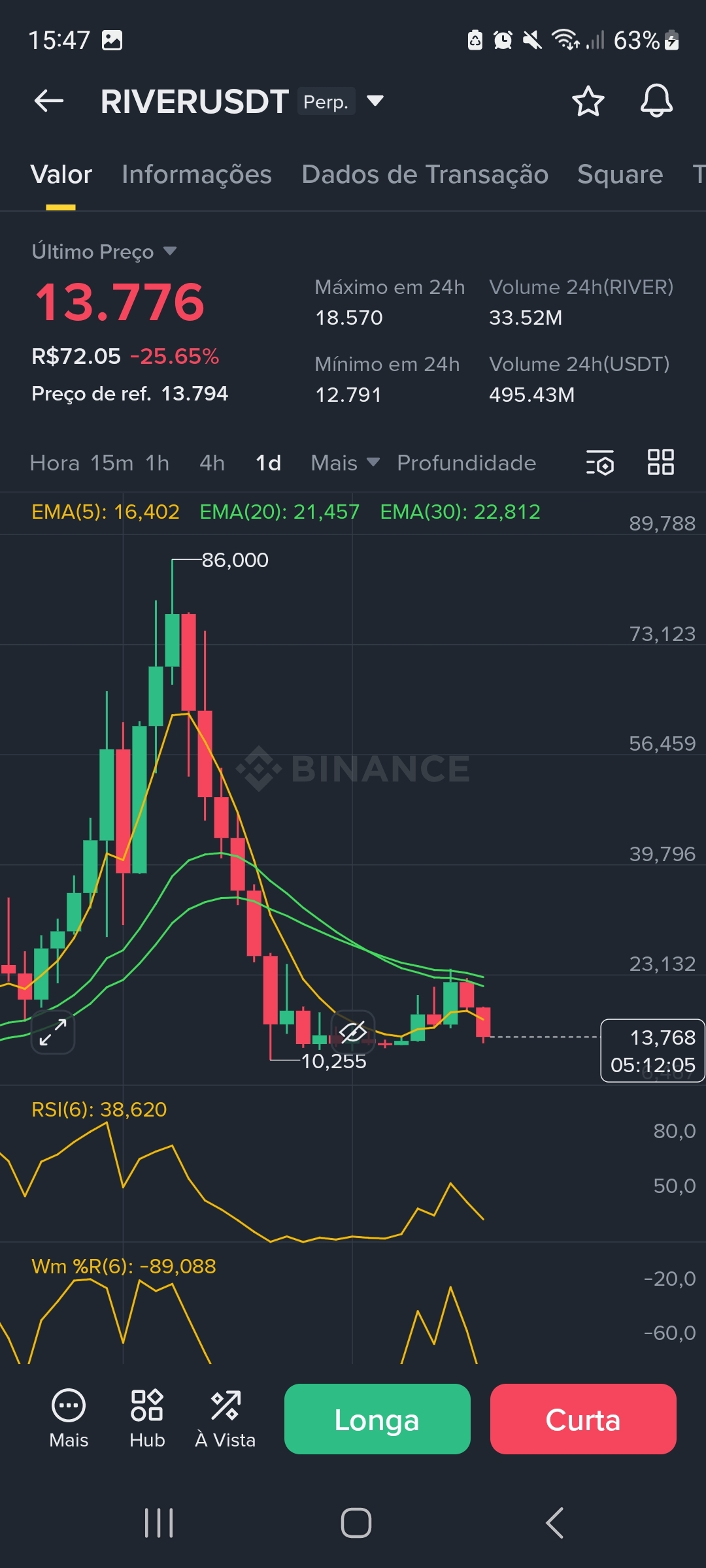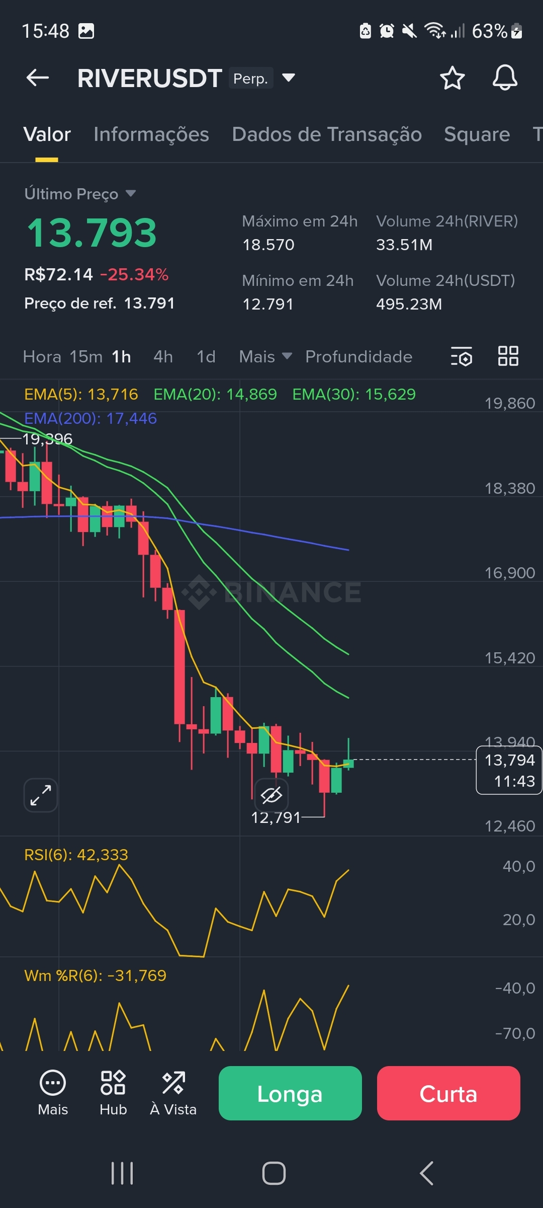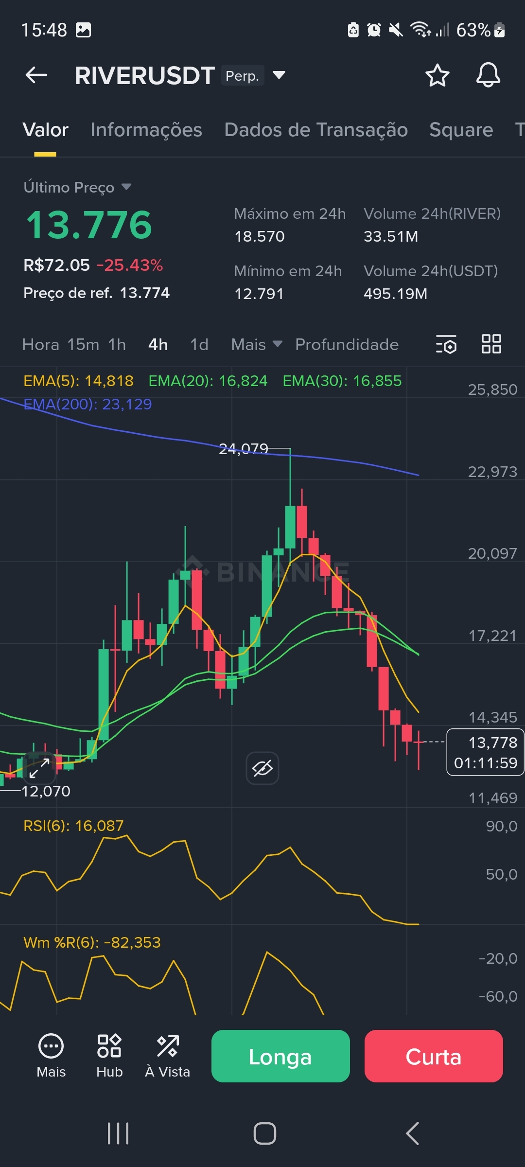 * Confirmação EMA 5 (+20%): No gráfico de 15m, o preço já fechou acima da EMA 5 (13.795) e da EMA 20 (13.719), confirmando o pivô de alta no micro-tempo.