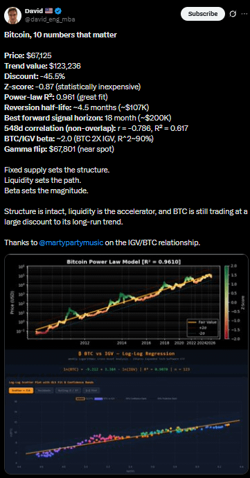 Right now, Bitcoin’s estimated trend value is around $123K, while spot price sits near $67K. That’s roughly a 45% discount to trend. Historically, this kind of gap doesn’t happen near cycle tops. It usually shows up during periods where price pauses while structure continues building underneath.