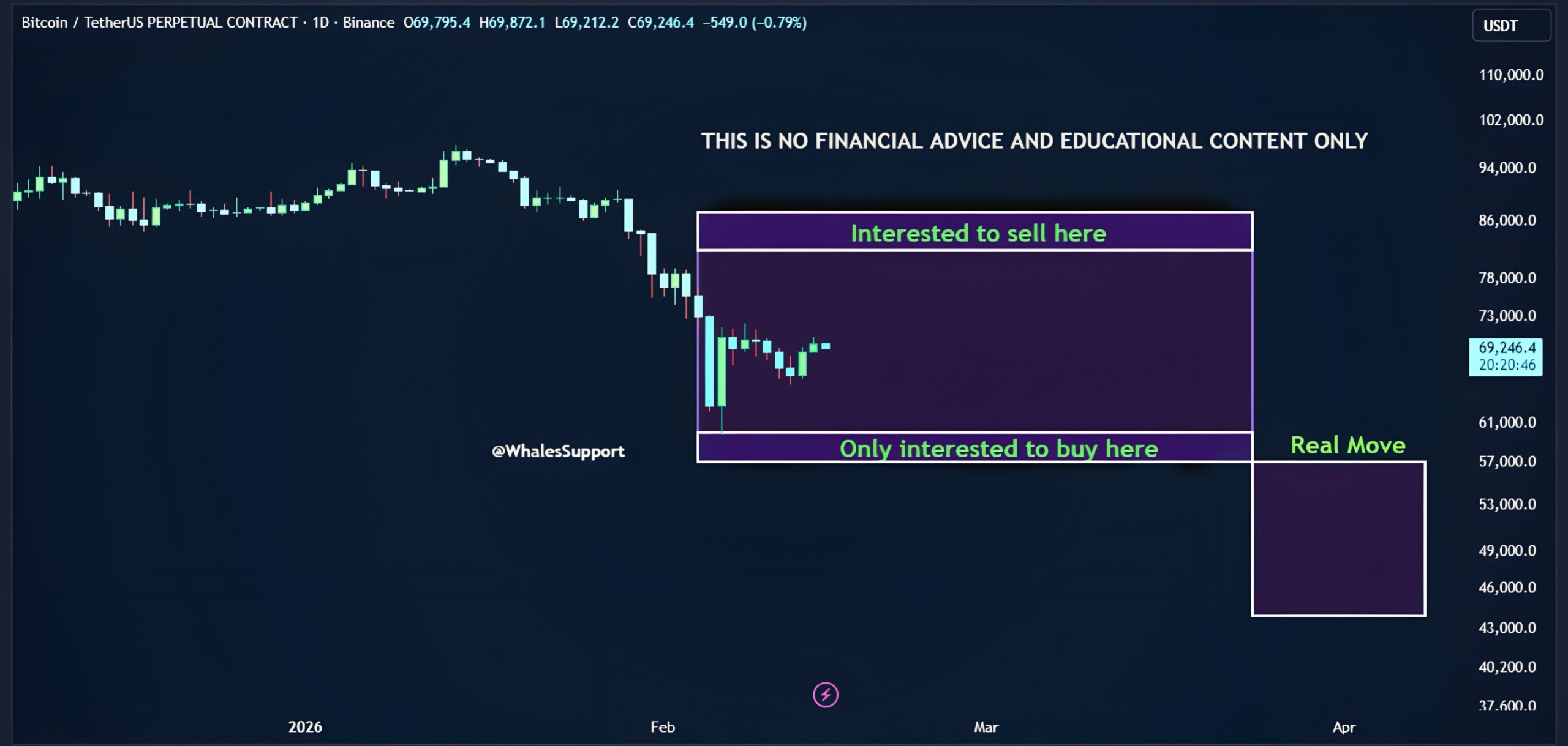 Recall: the 2024 box 58k-74k served multiple purposes, primarily drawing reference lines for the 2026 bear market. Now, in the exact same price zone but reversed context, it acts as structure, not support. Structure breaks eventually. We will see repeated tests of 57-60k, which I continue to view as the local phase bottom. My spot buys from that zone are now up ~16% on average, providing solid percentage gains while the macro downside remains fully intact.