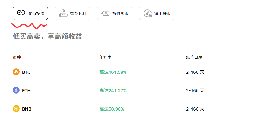 前面两个是保本打底,这个就是熊市横盘里的收益放大器!币安双币投资不用赌行情方向,涨跌都能赚,BTC 最高年化161.58%,ETH 最高直接冲到241.27%,期限 2-166 天可选,灵活度拉满!