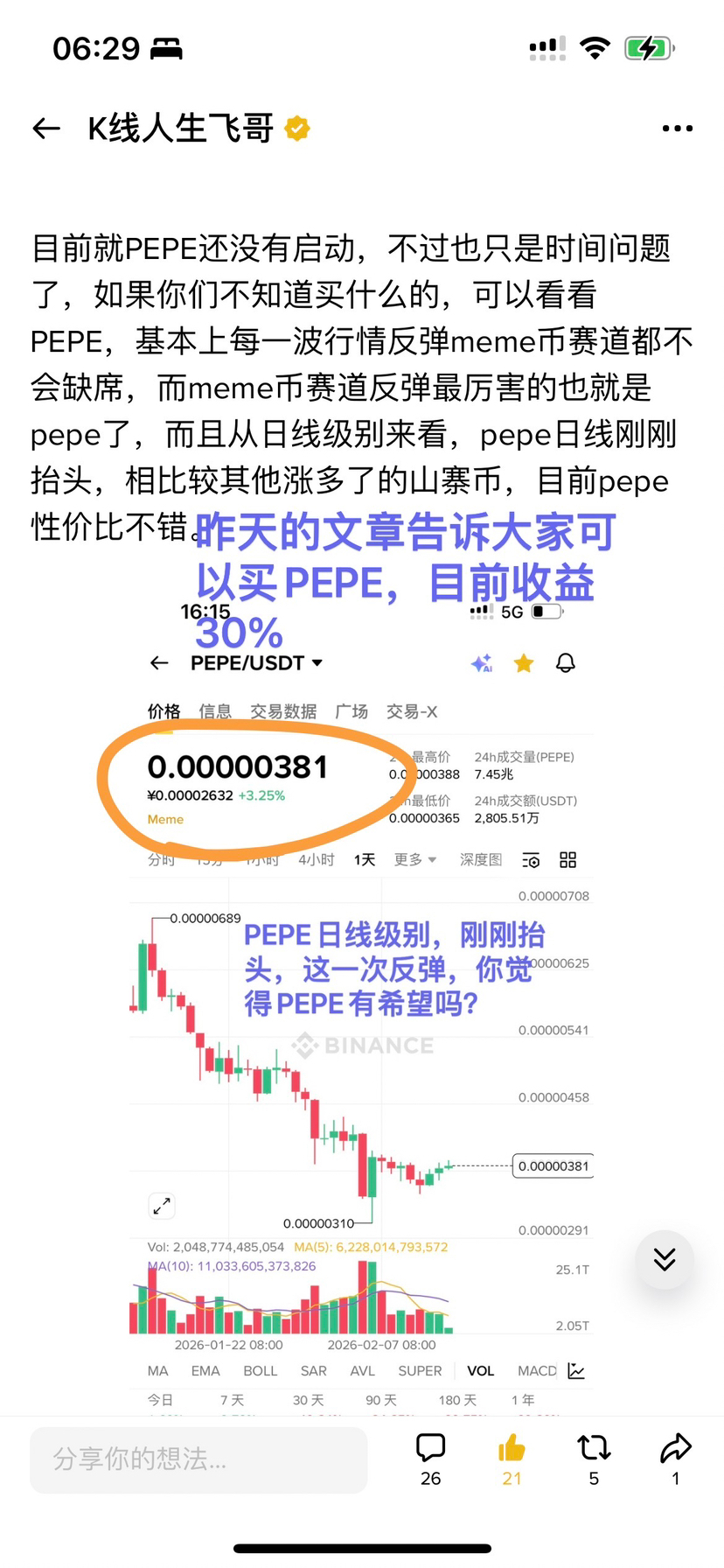 PEPE这个币,昨天文章也跟大家说过可以买,并且性价比很高,通过这个币赚到钱了的或者说认为我判断准确的,给我点个赞不过分吧