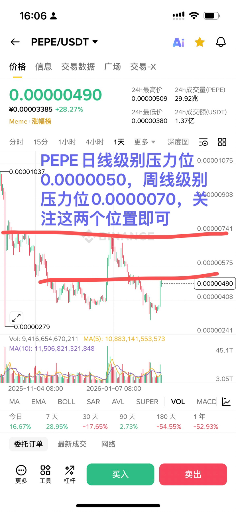 那么PEPE反弹的目标在哪里呢?我们直接从日线级别来看,PEPE这两天如果能稳住0.0000050这个位置,那么就还能向上在看一步空间,如果稳不住,那就赶紧跑路吧,不要担心卖飞,这是熊市中的反弹,卖飞永赚喔。