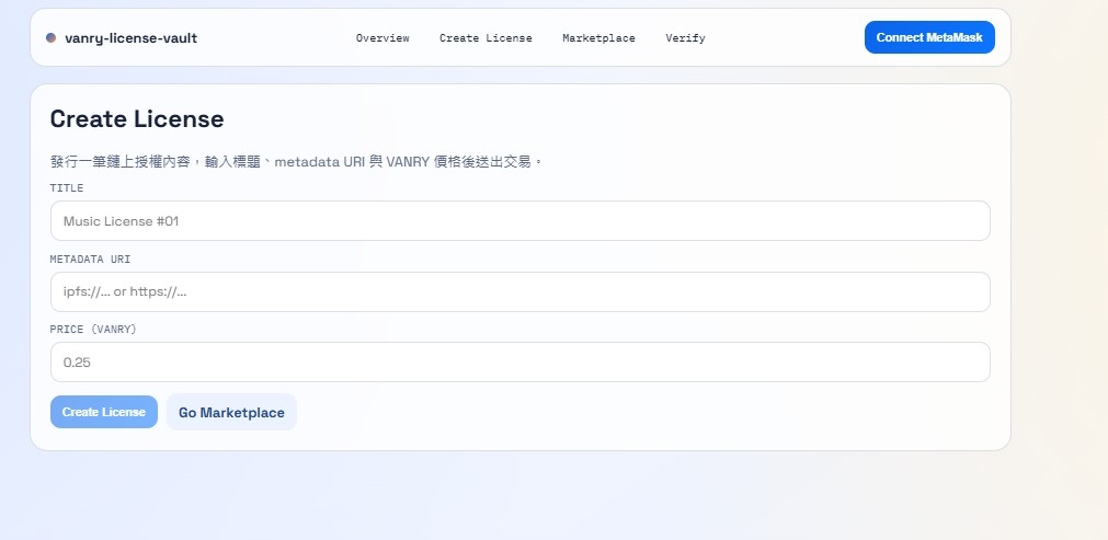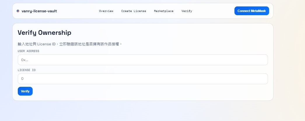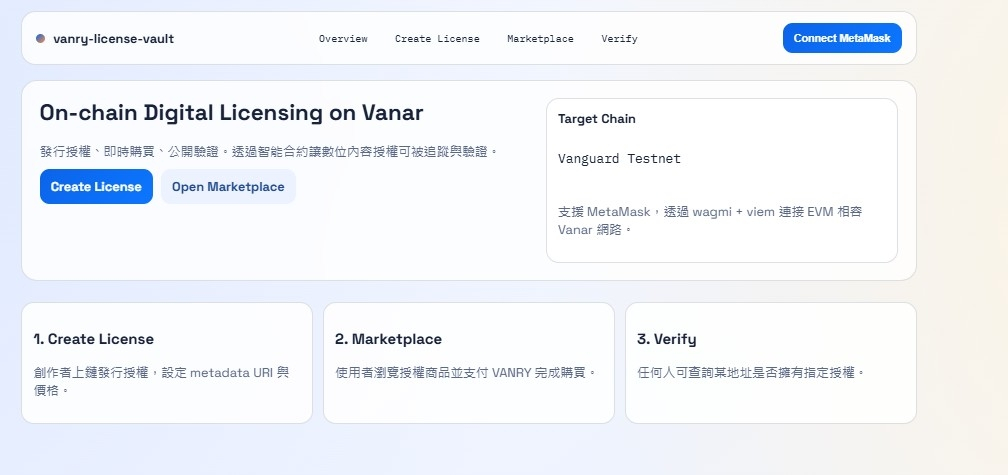 前端部分則使用 Next.js 搭配 wagmi 與 viem 連接 MetaMask,直接與 Vanar 網路互動。使用者可以在 Marketplace 頁面瀏覽所有授權內容,並以 $VANRY 完成支付;同時在 Verify 頁面輸入地址與 License ID,即可即時取得鏈上驗證結果。整體流程從合約呼叫、交易確認到狀態更新,都完全依賴 Vanar Chain 的鏈上資料,而非任何後端授權伺服器。