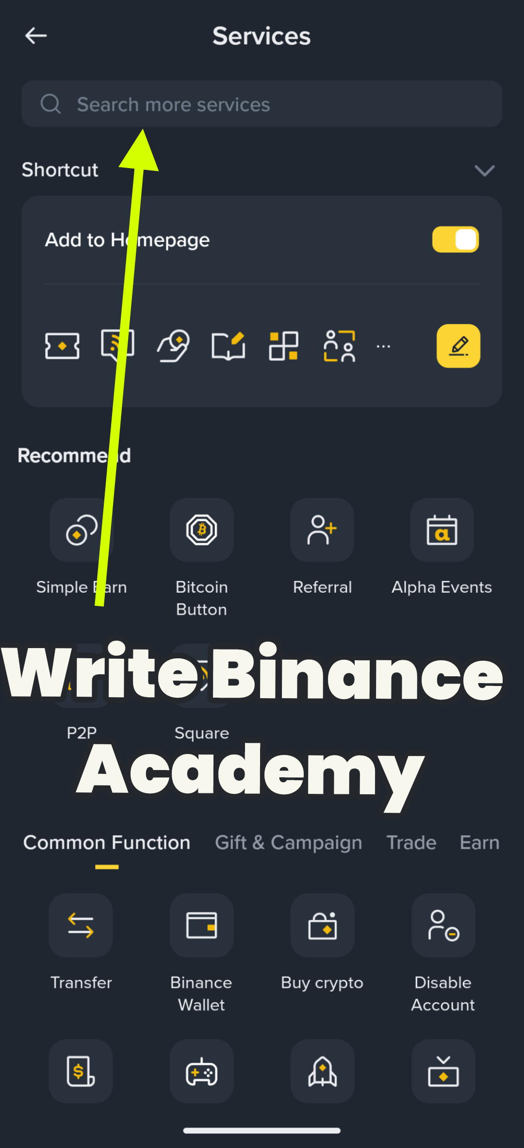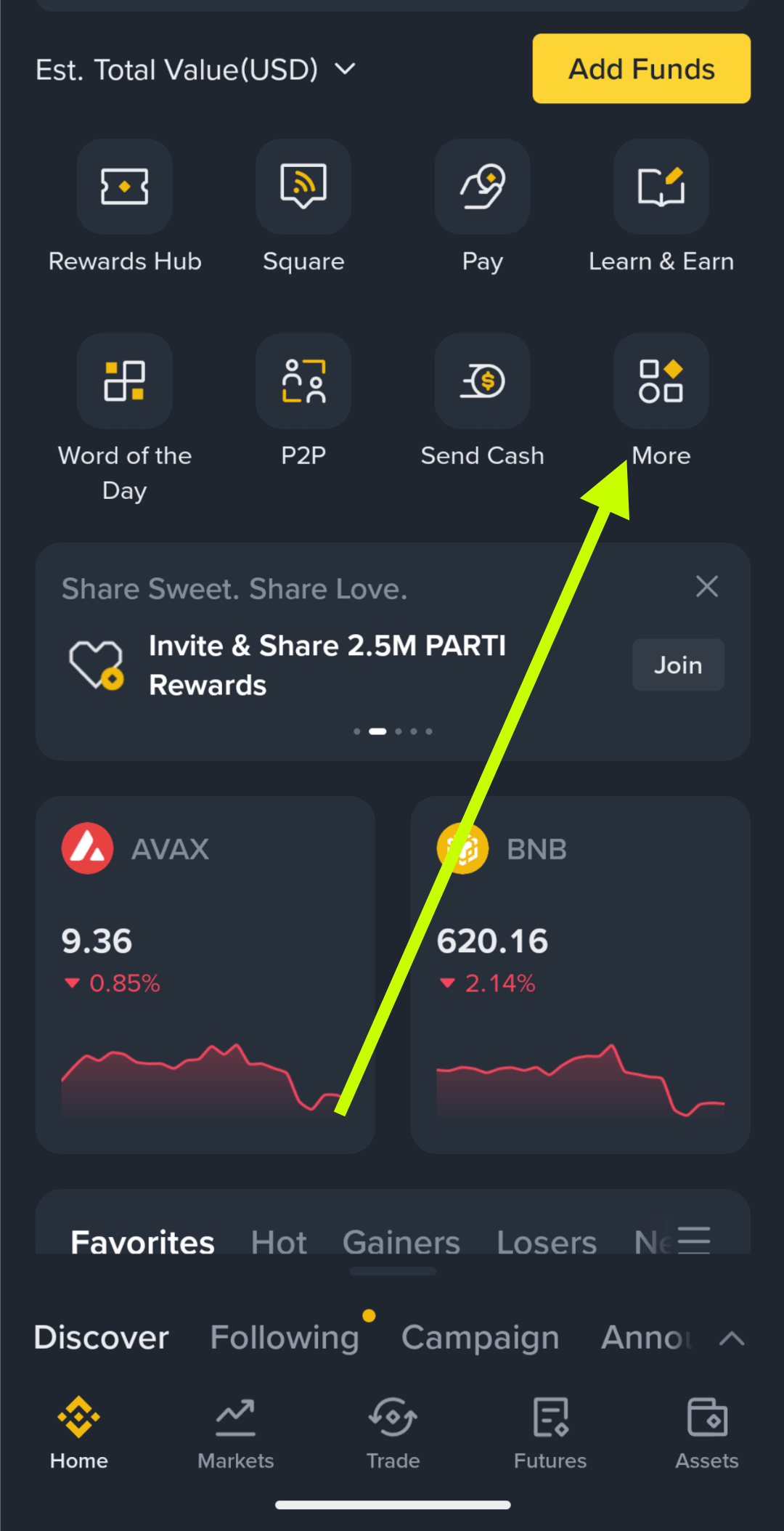 When you're in the discover page look for More options. You usually find it in the block where you have added your favorite Binance products and you see your balance there.
