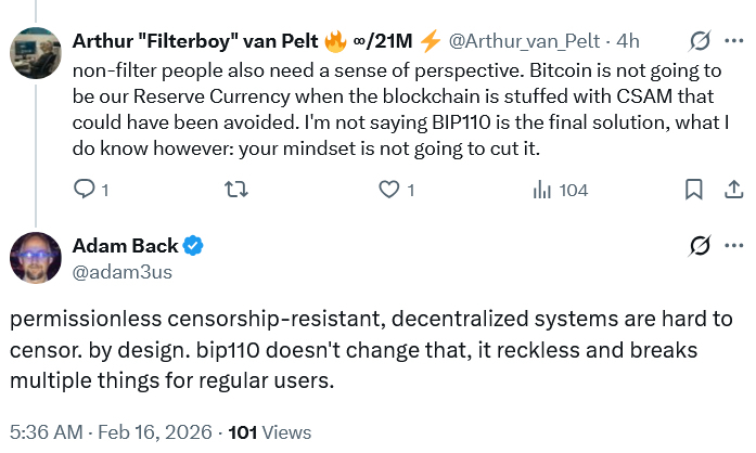 Back đồng ý rằng Bitcoin nên tập trung vào vai trò “sound money” (tiền tệ vững chắc), nhưng ông cho rằng không đáng để thay đổi ở cấp độ đồng thuận. Theo ông, spam hiện tại chỉ gây khó chịu chứ không đe dọa bảo mật mạng lưới. Ông cảnh báo BIP-110 có thể làm suy yếu uy tín của Bitcoin với tư cách là nơi lưu trữ giá trị an toàn.