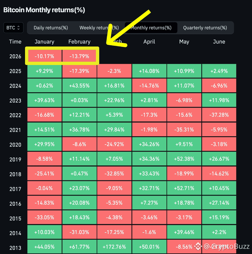 In short: It means the old seasonal “safety net” for early-year dips is gone for the first time. Whether that’s bullish capitulation fuel or bearish confirmation depends on your bias — but it’s definitely notable and sparking a lot of discussion right now. If March turns green and reclaims $80k+, the narrative flips hard to “pattern broken = new bull leg.” Otherwise, more pain possible.