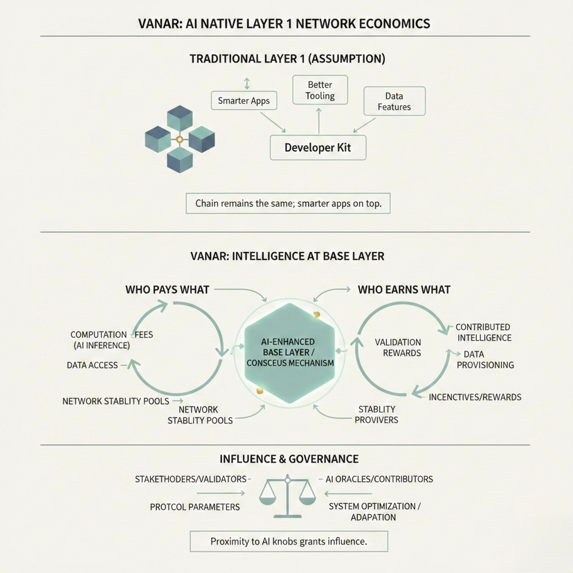 Most people hear AI native Layer 1 and picture a nicer developer kit. Better tooling, a few built in data features, maybe some agent support. The chain itself stays the same, just with smarter apps on top. Vanar makes that assumption hard to hold. When you try to push intelligence closer to the base layer, you end up changing the day to day economics of the network: who pays what, who earns what, and who quietly gains influence just by being closer to the knobs that keep the system stable.