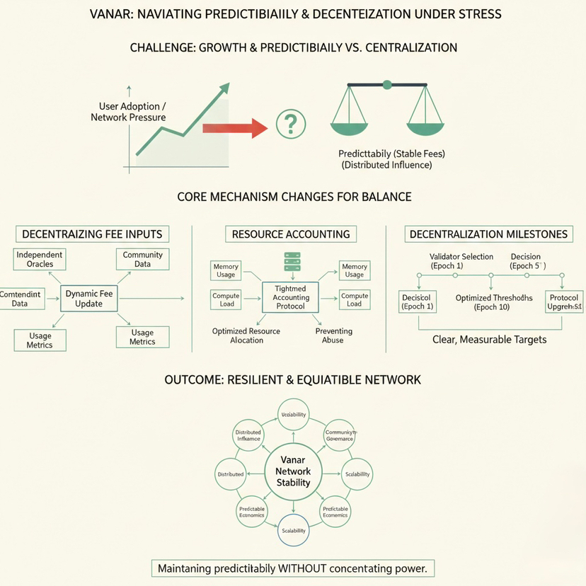 If the next market cycle brings more users and more pressure, the real test will be whether Vanar can keep its promise of predictability without concentrating too much influence in the same hands that maintain that predictability. The design changes that would matter most are not flashy. They are governance and mechanism changes: decentralizing the inputs that drive fee updates, tightening resource accounting for memory and compute heavy workloads, and setting clear, measurable decentralization milestones for validator selection and decision making.