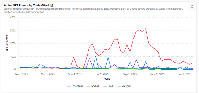 The decline in global NFT sales from the 2021 peak to more stable volumes in 2025 has shown a period of consolidation. Rather than a rebound, the market entered 2025 in a continued downtrend, with activity contracting across chains and concentrating around a limited set of intellectual properties and a few incentive-driven ecosystems.