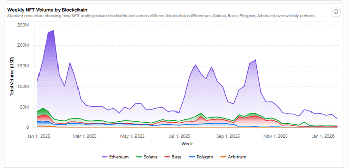 Ethereum became the main centre of NFT activity in 2025, accounting for about 74.6% of total trading volume, as remaining liquidity concentrated where infrastructure and tooling were already mature and where assets could be settled and reused efficiently.