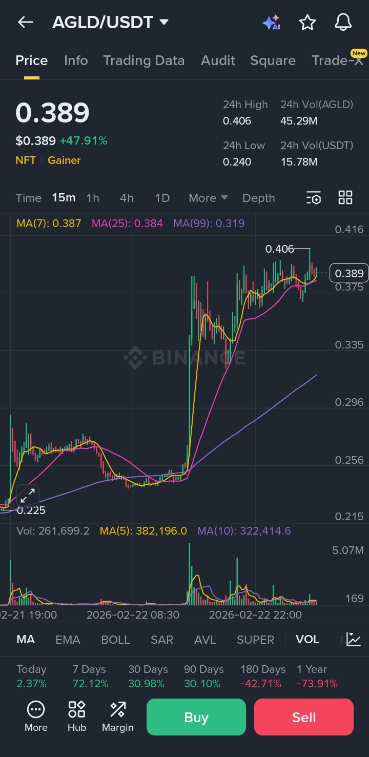 AGLD is pumping due to breakout from long accumulation, strong volume, bullish MA alignment, and renewed interest in gaming/NFT narrative. Short-term trend remains bullish above 0.35 support.