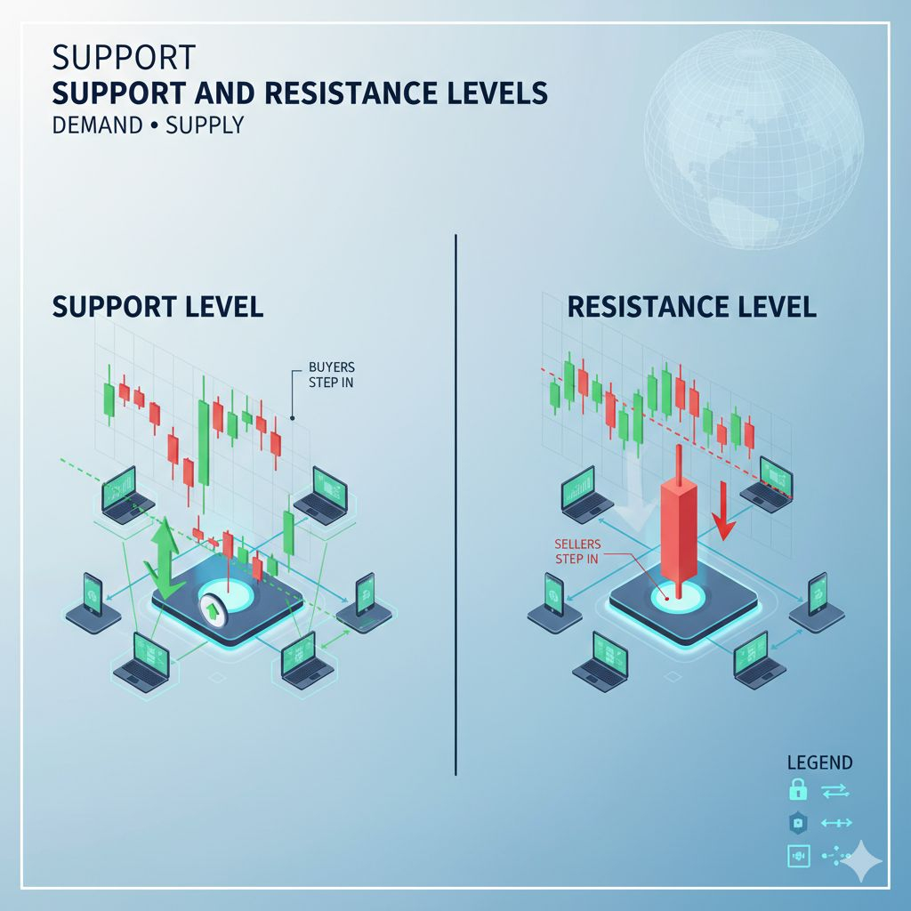 Support Level: A price level where a downtrend is expected to pause due to a concentration of demand. Buyers tend to step in at this level.