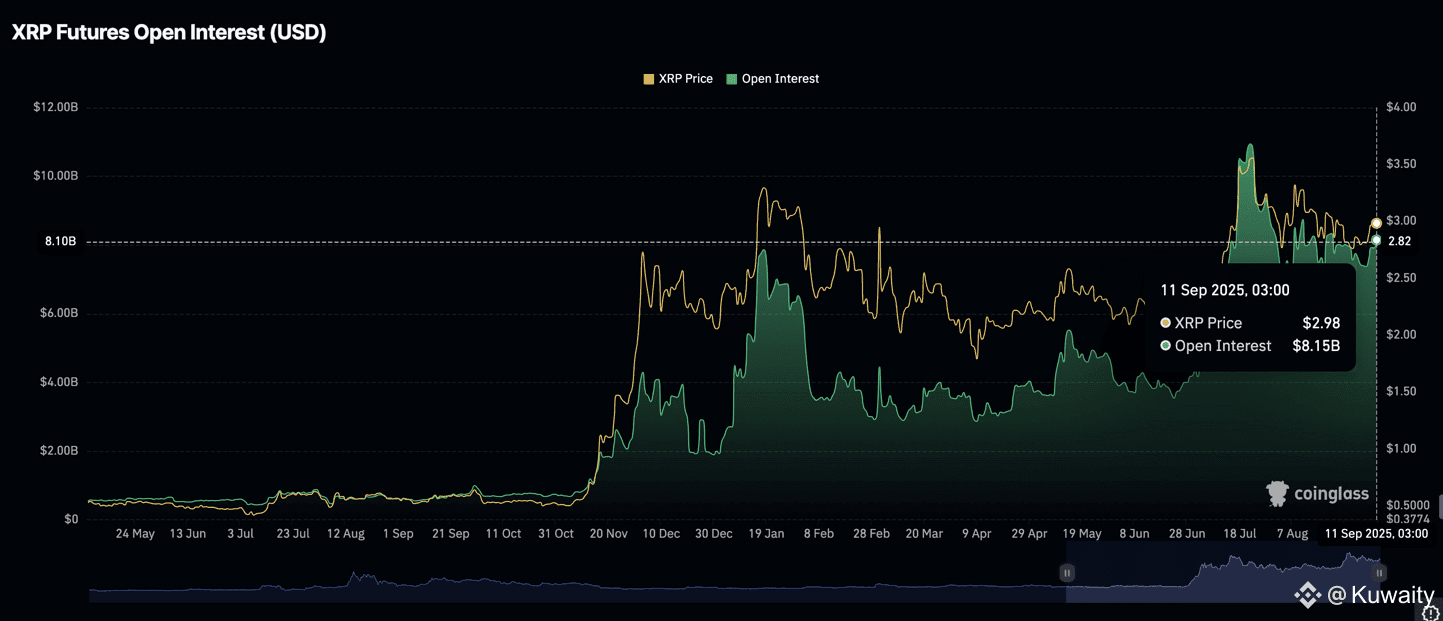 في الوقت نفسه، يظل الاهتمام بالتجزئة في $XRP مرتفعًا نسبيًا مقارنة بالأسبوع الماضي. تظهر بيانات CoinGlass أن الفائدة المفتوحة لعقود XRP الآجلة (OI) تتوسط عند 8.15 مليار دولار يوم الخميس، ارتفاعًا من 7.37 مليار دولار يوم الأحد.