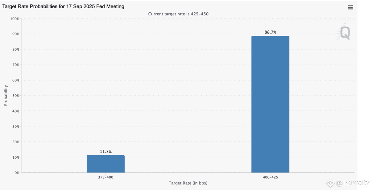 بعد تقرير مؤشر أسعار المستهلكين، تراجعت التوقعات بشأن خفض سعر الفائدة بمقدار 0.25 نقطة مئوية في سبتمبر إلى نطاق 4.00% إلى 4.25% قليلاً من حوالي 91% يوم الأربعاء إلى 88.7% في وقت كتابة هذا التقرير يوم الخميس، وفقًا لأداة FedWatch التابعة لمجموعة CME.