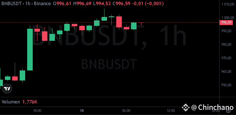 Según datos de CoinMarketCap, BNB llegó hoy hasta $1,004.82, un +4,51% en 24 horas, tras despegar desde un mínimo diario de $947.77. El volumen de operaciones creció en paralelo, subiendo 15,22% hasta $3.87 mil millones, señal de que el apetito inversor sigue intacto.