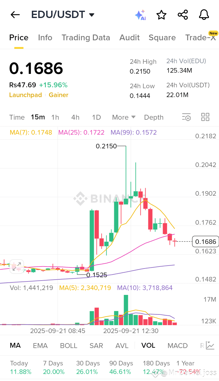 $EDU is showing strong momentum today, with the price currently at $0.1686, up +15.96% in the last 24 hours. đ
