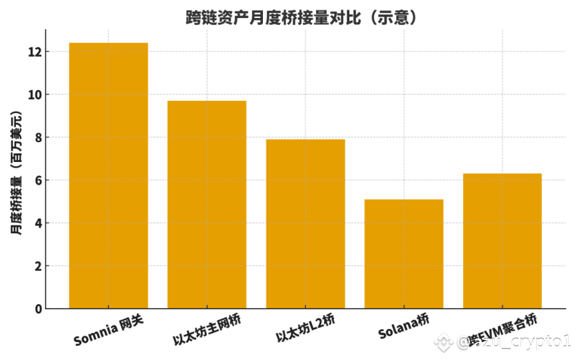 判断 Somnia 跨链系统是否可行,第一看“吞吐与可达性”。供给侧的含义是:Somnia 网关是否能稳定接入主流资产与链,是否能在高峰期保持稳定结算。下面的示意对比图,展示了 Somnia 网关与行业常见桥的月度桥接量对比(以等权样本为准,口径一致、去极值处理)。