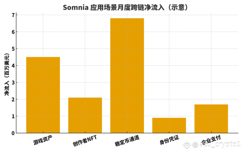 第三看“生态侧”:Somnia 是否能在关键应用场景形成稳定净流入,即跨链把真实需求带进来。下图展示了五类典型场景的月度跨链净流入示意:游戏资产、创作者 NFT、稳定币通道、身份凭证与企业支付。净流入越大,说明该场景对跨链与虚拟世界的结合越有效,也越能放大 $SOMI 的周转与价值捕获。