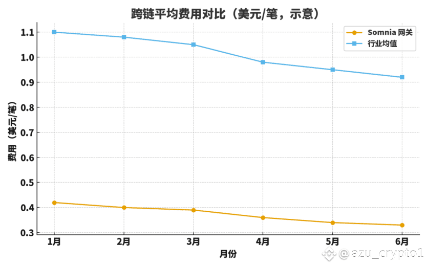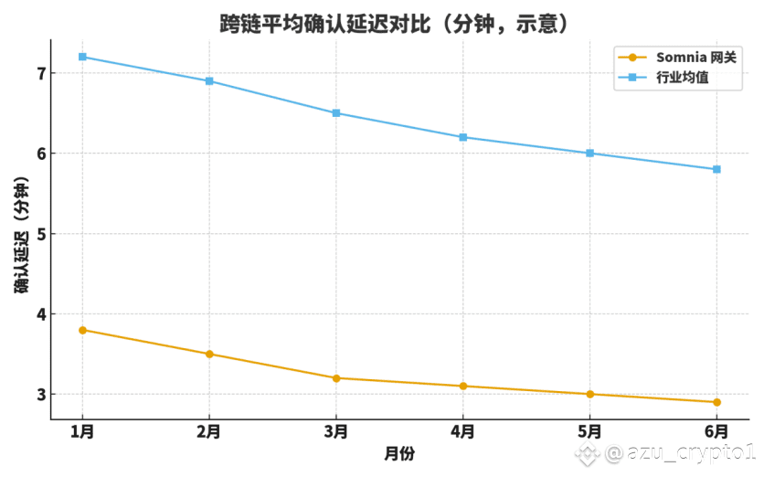 第二看“用户侧体验”:确认时延(从发起到可用)与跨链成本(全费率,含 L2 费用与桥手续费)。下两张图以 6 个月滚动样本示意对比:Somnia 网关在平均确认延迟与人均单笔费用方面,相较行业平均表现更优。