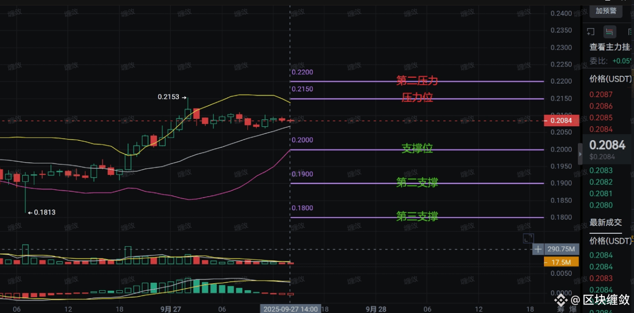 看1小时K线图。当前价0.2084已强势站稳0.2000支撑,且黄色均线金叉灰色线,形成多头排列。更关键的是,价格正兵临0.2150压力城下,一旦放量突破0.2200,上涨空间将彻底打开!