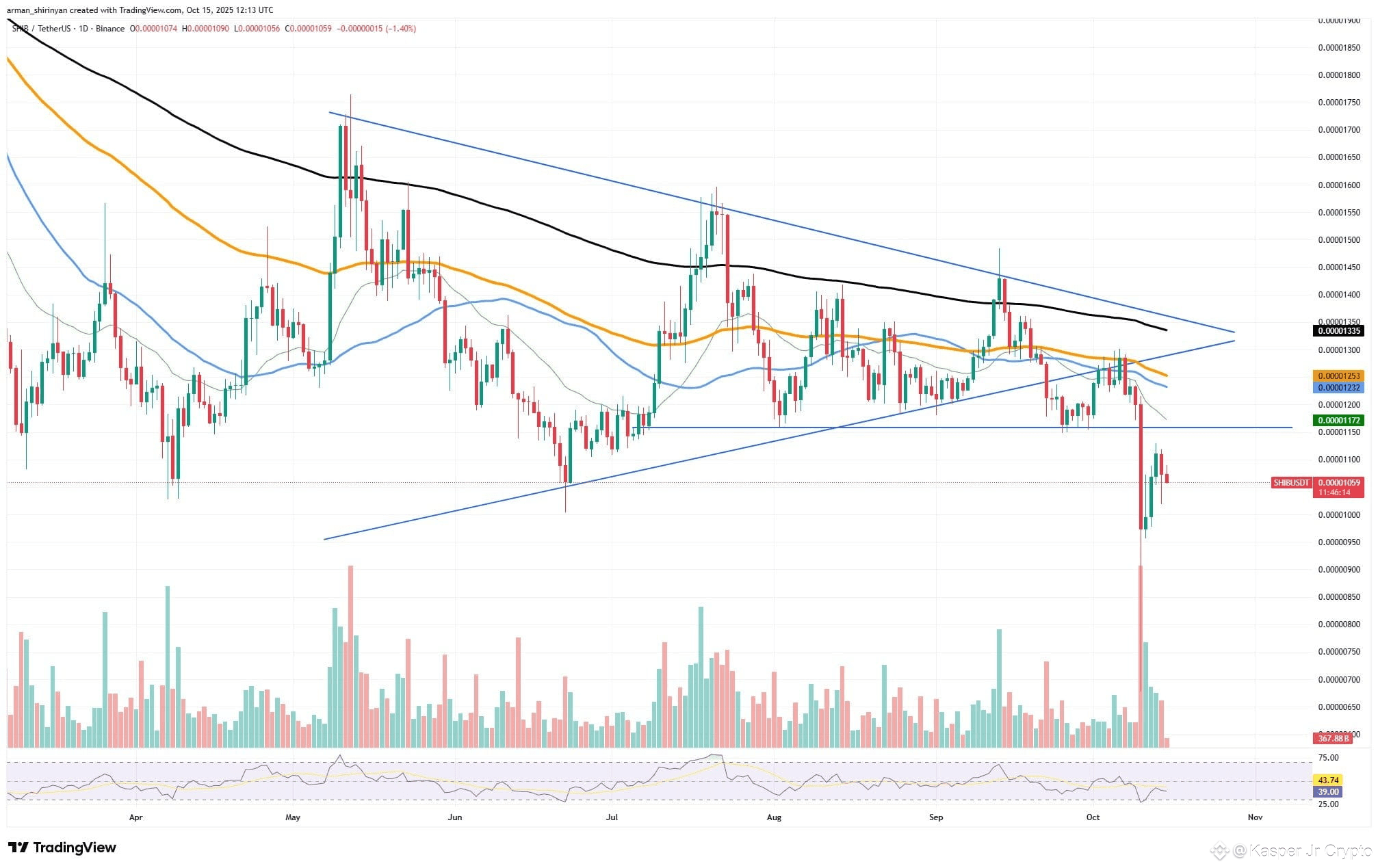 La tendance quotidienne est toujours piégée dans un triangle descendant, et la moyenne mobile exponentielle à 200 jours, qui se situe bien au-dessus des niveaux de prix actuels, indique que le marché est profondément épuisé. La vente actuelle a commencé début octobre, lorsque SHIB a franchi le seuil psychologique de 0,0000100 $, suivi d'un faible rebond.