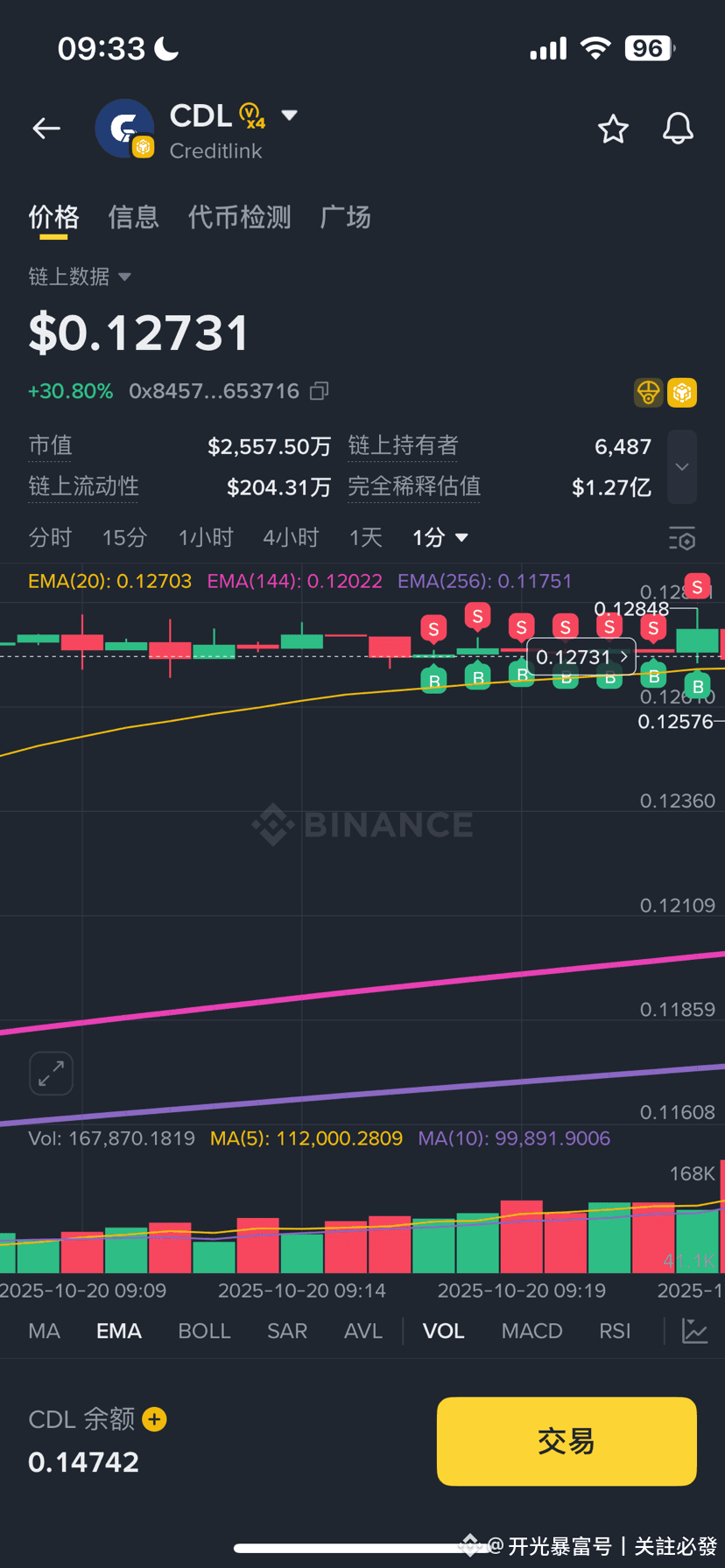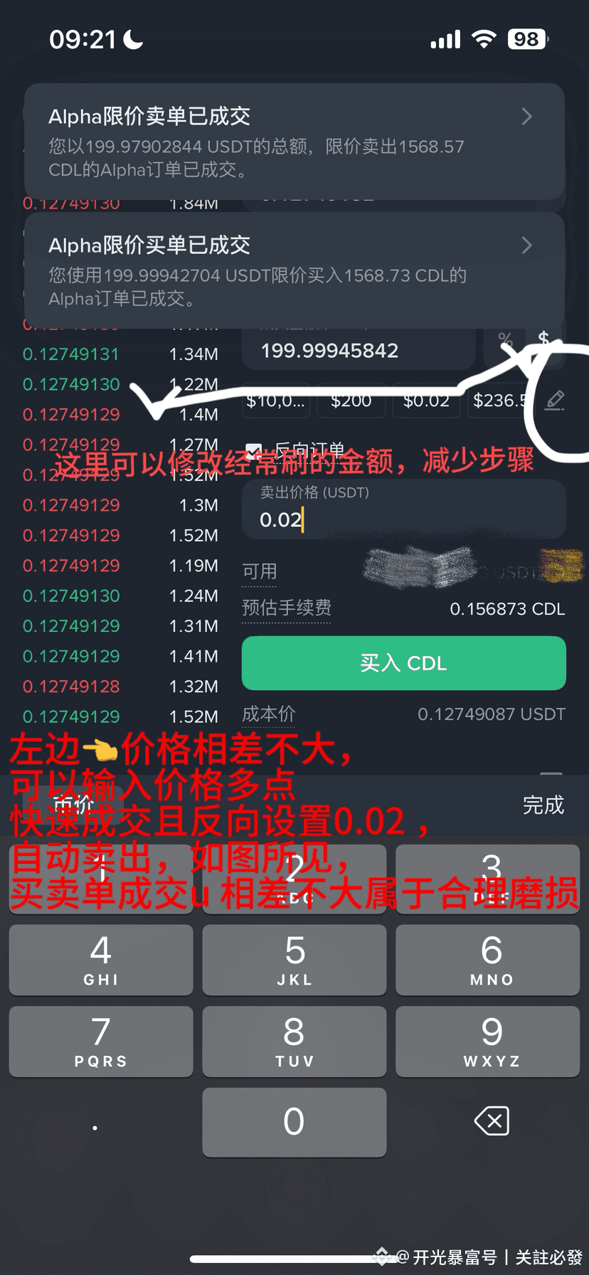 首先左边👈买卖价格相差不大,比如买0.1249131 ,我们买入可以设置0.1249132反向设置0.02 达到快速买卖出如图