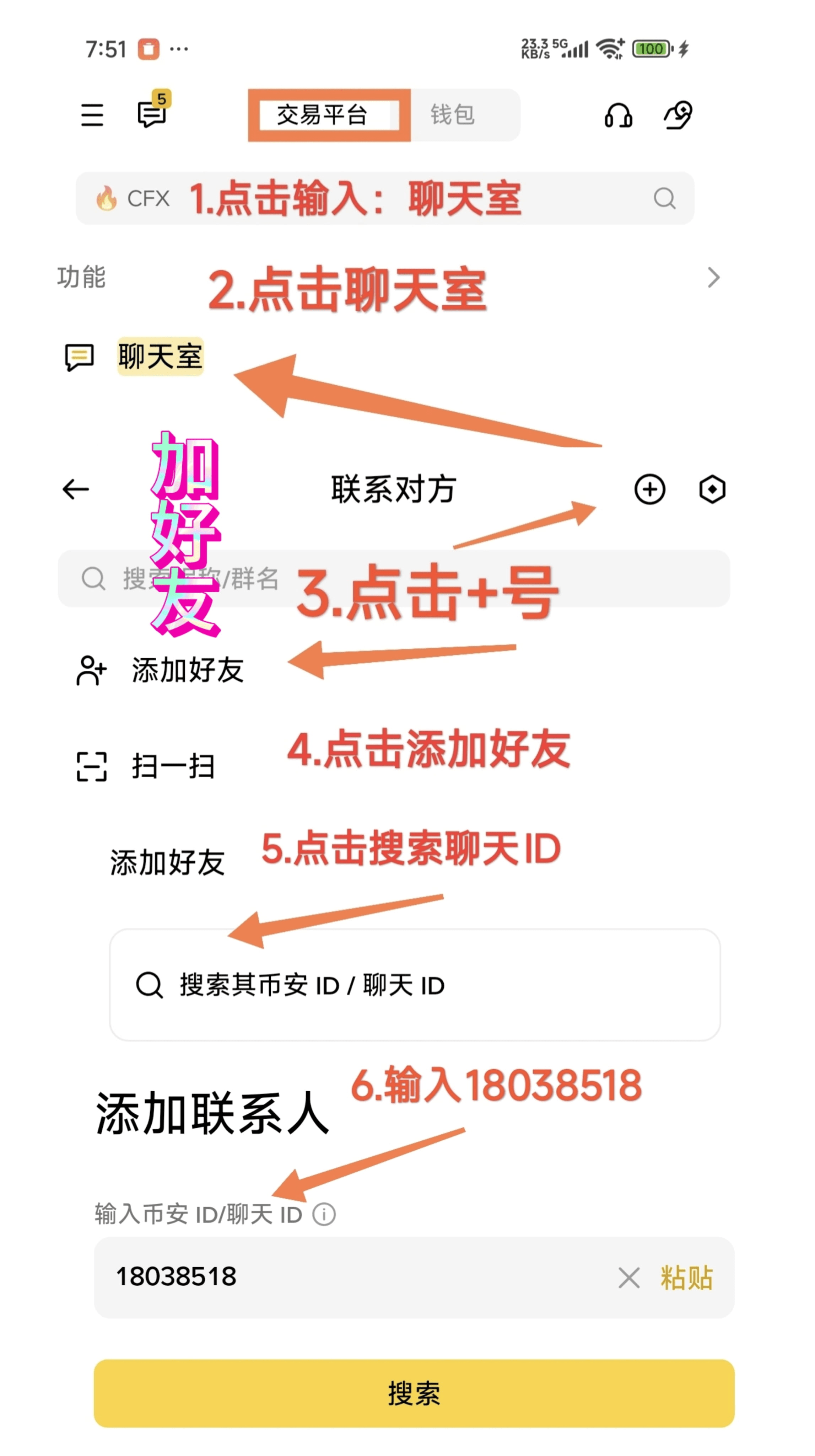 币安可以互加好友,我ID:18038518,也可以加我拉你进群,不懂回复留言。想加入其他群,看首页第二篇帖子。