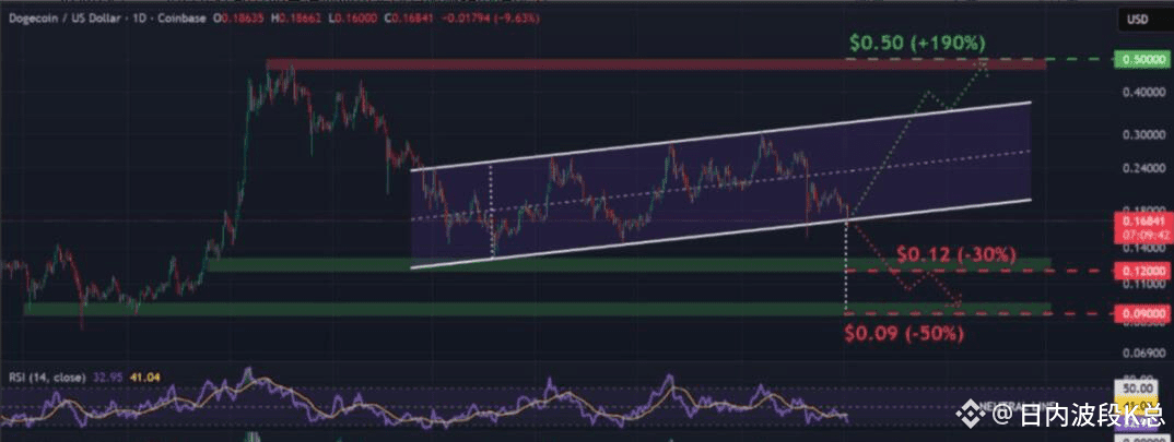 如果价格能在此区域企稳回升,当前的下跌趋势或将扭转,上升通道结构有望修复。一旦买盘动能重新转强,不排除出现高达190%的反弹,目标价位甚至可能上看0.50。
