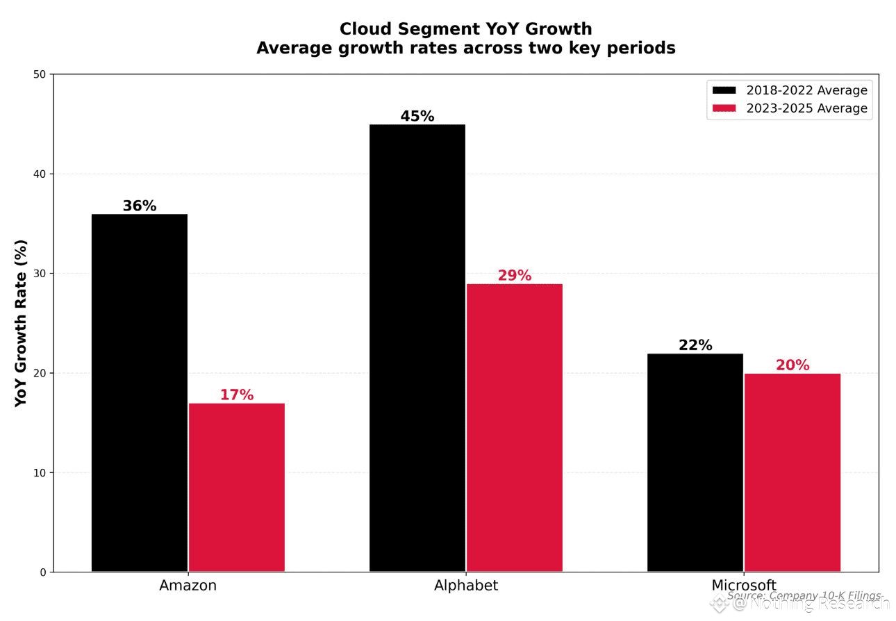 1. 亚马逊、谷歌和微软的云服务增长(2023–2025 vs 2018–2022)都在变缓