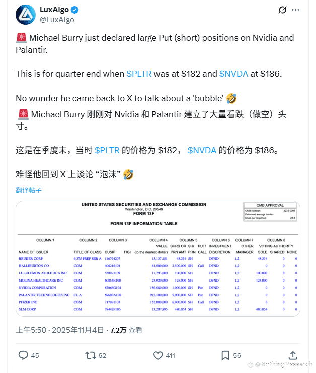 在社交媒体时代,一个好处是可以第一时间看到那些“活在新闻里”的知名投资人真实在想什么。最近很多媒体报道《大空头》原型 Michael Burry,这位曾经在 08 年做空次贷的投资人,再次发布警告 AI 存在大泡沫。