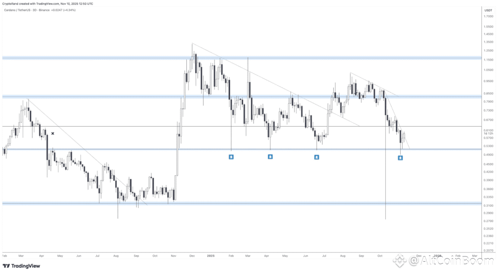 Cardano (ADA/USDT) is challenging its local downtrend resistance on the 3-day chart. ADA has formed a series of lower highs since mid-2025, indicating ongoing bearish pressure in the market.