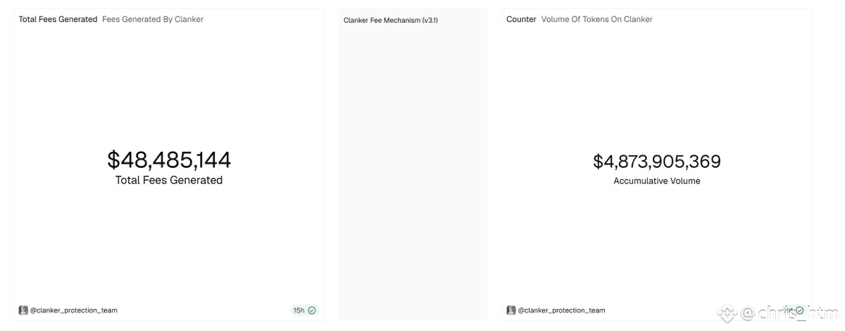 Clanker在发布后的一年里总计发生了4,873,905,369U的交易,总共收取的48,485,144U的协议手续费(这里要注意手续费有部分收取的是项目代币,并且其中有约40%是创作者收益。)