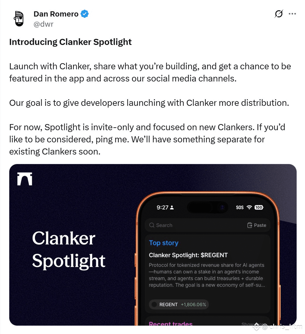 Farcaster给clanker带来的绝不仅仅是代币经济学变化这么简单,在clanker被收购后的一周,Farcaster推出了Clanker spotlight功能,为在Clanker上推出的优质项目提供一个APP内部曝光率极高的广告位。