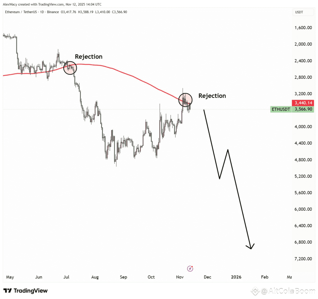 Analysts indicate that failure to break above this moving average can trigger renewed downtrends. The black arrow on daily charts suggests potential declines toward support zones below $3,000 if selling pressure intensifies.